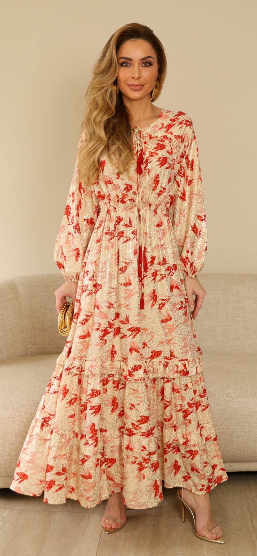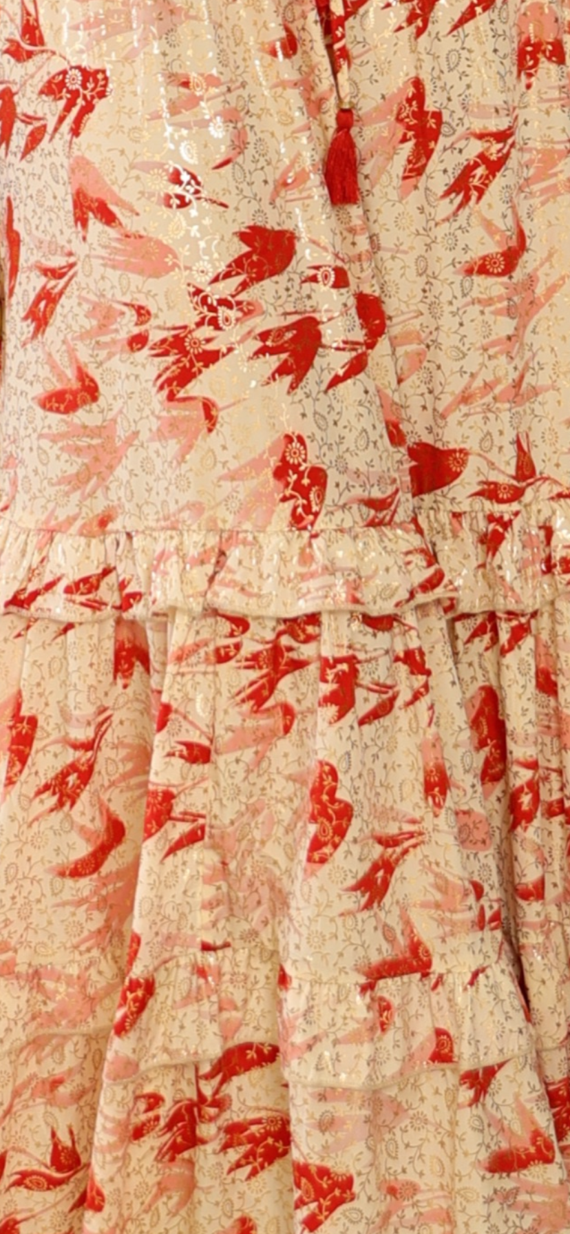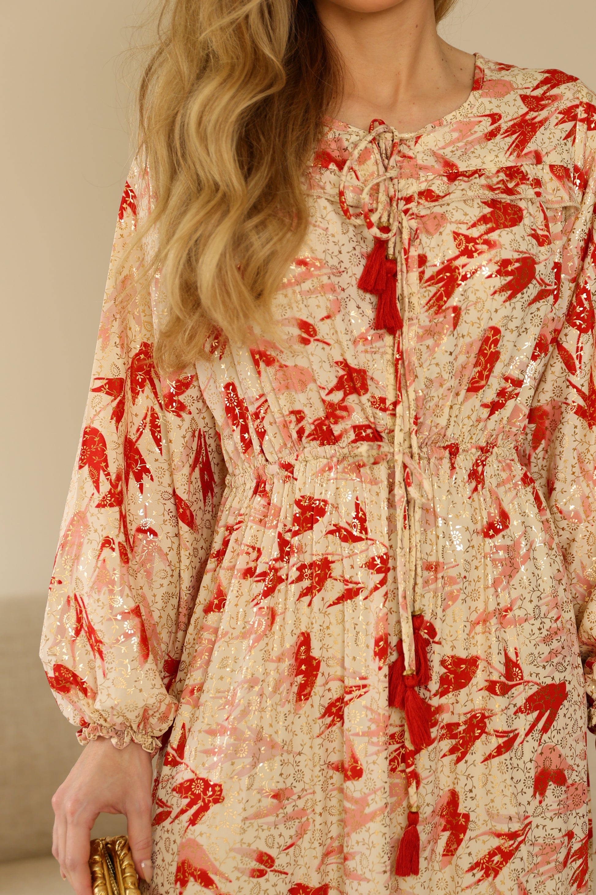 Vestido Nice com ajuste na cintura. Com 2 cordões pom pom