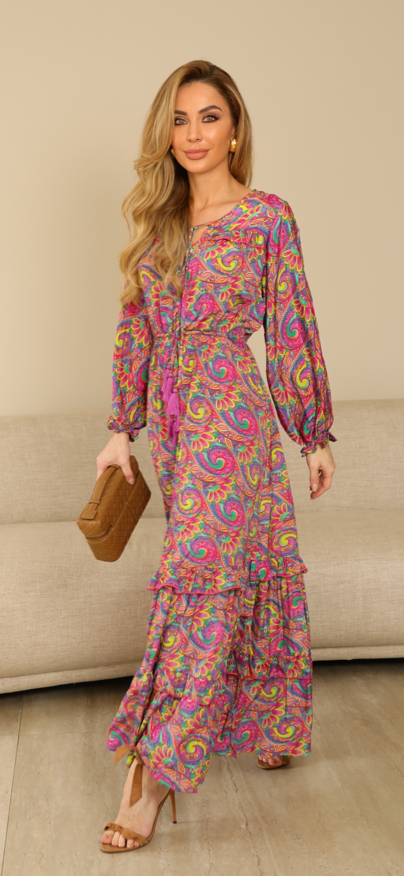 Vestido Nice com ajuste na cintura. Com 2 cordões pom pom